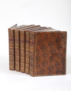 5 vol. in-4 de XLIV-460-VIII-432-VIII-374-VIII-413-[3]-XII-510-[2] pp. reliés plein veau moucheté époque, dos à nerfs à caissons fleuris, triple filet d'encadrement sur les plats, roulette sur les coupes, pièce de titre & tomaison bordeaux, tranches jaspées. Paris Hôtel de Thou 1778. (Première édition française, illustrée d'1 beau frontispice du portrait de l'auteur, de 66 planches dont le 10 bis, & de 2 tableaux hors-texte). Ex-libris.