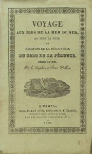 * DILLON (Capitaine Peter) Voyage aux îles de la Mer du Sud entre 1827 et 1828, et relation de la découverte du sort de La Pérouse. 2 vol. in-8 brochés, couverture verte ornementée. Paris Pillet Aîné 1830 (Edition Originale). Avec 2 planches...