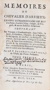Mémoires en première édition, publiés sur les manuscrits du chevalier d'Arvieux, par le Père Labat. Laurent d'Arvieux passa 12 ans dans le Levant et devint, par là-même, fin connaisseur des coutumes orientales. Il collabora aussi avec Molière et Lully à l'élaboration du " Bourgeois Gentilhomme " qui devait contenir des turqueries pour faire plaisir au roi Louis XIV.