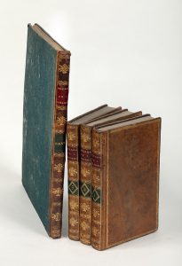 Bengale ; d'un recueil d'observations sur la probabilité d'un passage Nord-Ouest ; et d'un traité abrégé du commerce entre la côte Nord-Ouest et la Chine, etc. 3 vol. in-8 de XXIV-391-386-371-[1] pp. reliés plein veau raciné époque, dos lisse à caissons ornés, roulette d'encadrement doré sur les plats. Paris Buisson An III-1795 (Edition Originale de la traduction) + ATLAS Collection de cartes géographiques, vues marines, plans... et portraits relatifs aux voyages du capitaine Meares...1 vol. gd in-4 relié ½ veau, dos lisse orné. Avec 28 cartes et vues, certaines dépliantes. Ex-libris manuscrit.