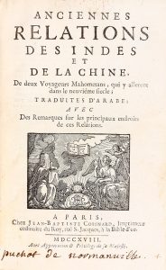 * ANONYME [RENAUDOT (Abbé Eusèbe)] Anciennes relations des Indes et de la Chine de deux voyageurs mahométans qui y allèrent dans le IXe siècle, avec des remarques sur les principaux endroits de ces relations. 1 vol. in-8 de XXXIX-[1]-397-[15]...