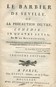 BEAUMARCHAIS (P.-A. Caron de). Le Barbier de Séville, ou La Précaution inutile. Comédie en quatre actes. Représentée et tombée sur le Théâtre de la Comédie Françoise aux Tuileries, le 23 de Février 1775. Troisième édition. Paris, Ruault,...