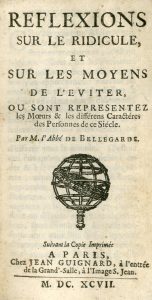 BELLEGARDE (Abbé de). Réflexions sur le ridicule, et sur les moyens de l'éviter, ou sont representez les moeurs et les différens caractéres des personnes de ce siécle. Suivant la copie imprimée, Paris, Jean Guignard (marque typographique à la...