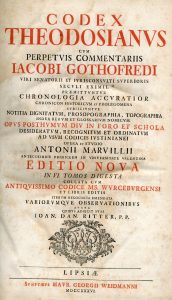 Codex theodosianus cum perpetuis commentariis Jacobi Gothofredi [...]. Praemittuntur chronologia accuratior chronicon historicum et prolegomena subiiciuntur notitia dignitatum, prosopographia, topographia index rerum et glossarium nomicum. Opus...
