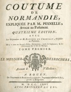 de la Cour du Parlement de Rouen, rendu les chambres assemblées, portant Règlement général pour les Dîmes. Sans lieu, J.J. Le Boullenger, 1784, petit 4°, 4 p., pleine basane brune de l'époque, dos à nerfs orné (reliure abîmée avec manques). La fleur de lys du bandeau de la p. 1 est maculée (par un révolutionnaire ?). Documents manuscrits, datés de 1787, ajoutés en tête. Étiquette de propriétaire au titre : « LE MONNIER-DESROCHERS, Avocat à Villedieu ». Pesnelle a accompli un habile travail de réorganisation et de clarification ; à cet égard ses introductions apparaissent essentielles et ses divisions et subdivisions judicieuses. La plupart des coutumes particulières sont rapportées à celles de Paris.