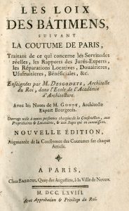 DESGODETS. Les loix des bâtimens, suivant la coutume de Paris, traitant de ce qui concerne les servitudes réelles, les rapports des jurés-experts, les réparations locatives, douairieres, usufruitieres, bénéficiales, etc. Avec les Notes de M....