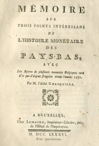 GHESQUIERE (Abbé Joseph de). Mémoire sur trois points intéressans de l'histoire monétaire des Pays-Bas, avec les figures de plusieurs monnoies Belgiques tant d'or que d'argent frappées avant l'année 1450. Bruxelles, Lemaire, 1786, 8°, 214-[1...