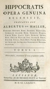 HIPPOCRATE / HALLER. Hippocratis Opera genuina recensuit, praefatus est Albertus de Haller. Editio altera, emendatior et nova praefatione aucta. Lausannae, Sumptibus Julii Henrici Pott et socior., 1784, 4 vol. 8°, XVI-498, VI-478, [6]-450 et VI-418...