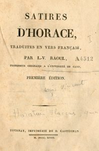 Imprimerie Casterman.- HORACE. Satires. Traduit en français par L.-V. Raoul. Première édition. Tournay, Imprimerie de D. Casterman, 1818, 8°, VI-226-[2] p. Broché avec : PERSE. Satires. Traduit en vers français par L.-V. Raoul. 2e édition....