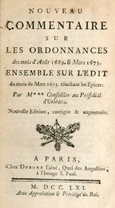 [JOUSSE (Daniel)]. Nouveau commentaire sur les ordonnances des mois d'août 1669 et mars 1673. Ensemble sur l'édit du mois de mars 1673 touchant les épices. Nouvelle édition, corrigée et augmentée. Paris, Debure, 1761, in-12, XII-240 p. Relié...