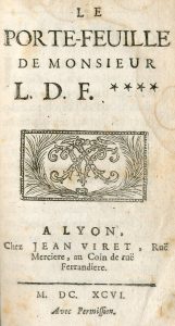 [LAFAILLE (L. DE)]. Le Porte-Feuille de Monsieur L.D.F.***. Lyon, Jean Viret, 1696, in-32, 179-[1 blanche] p., pleine basane brune, dos à nerfs décoré (rel. frottée, rouss., mouill.). Ouvrage attribué par Barbier à L. de Lafaille, auteur des «...