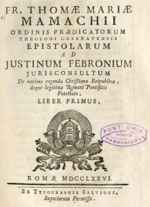 MAMACHI (Thomas Marie).- Fr. Thomae Mariae Mamachii ordinis praedicatorum theologi Casanaternsis Epistolarum ad Justinum Febronium jurisconsultum De ratione regendae Christianae Reipublicae, deque legitima Romani Pontificis potestate. Romae, Ex...