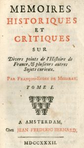 MEZERAY (François Eudes de). Mémoires historiques et critiques sur divers points de l'histoire de France, et plusieurs autres sujets curieux. Amsterdam, Jean Frederic Bernard, 1732, 2 vol. in-12 reliés en un, [2]-LVIII-194 et [2]-168-[4 (Catalogue...
