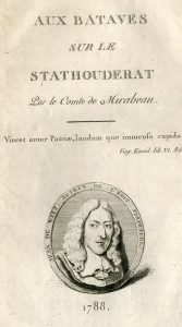 MIRABEAU (Gabriel-Honoré Riquetti, comte de). Aux Bataves sur le Stathouderat. Sans lieu ni édit., 1788, 8°, titre gravé avec le portrait de Jean de Witt, f. de titre, 147-1 blanche-213-[1 (errata)] (notes et pièces justificatives) p., cart....