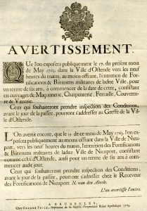 Oostende / Nieuwpoort.- Avertissement. Un placard de 42,5 x 34 cm (Bruxelles, George Fricx, 1763). Demande de soumission pour l'entretien des fortifications et des bâtiments militaires respectivement d'Ostende (17 mai 1763) et de Nieuport (19 mai...