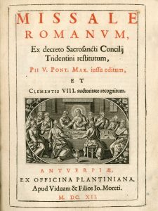 Plantin.- Missale romanum, ex decreto Sacrosancti Concilij Tridentini restitutum, Pii V. Pont. Max. iussu editum, et Clementis VIII. Auctoritate recognitum. Antverpiae, Ex Officina Plantiniana, Apud Viduam et Filios Io. Moreti, 1612, 4°,...