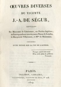 SEGUR (Vicomte J.-A. de). Oeuvres diverses. Précédées d'une notice sur la vie de l'auteur. Paris, Dalibon, 1819, 8°, 430 p., demi-veau brun à coins de l'époque, dos lisse, pièce de titre. Bel ex. Avec 11 lettres de Ninon de Laclos....