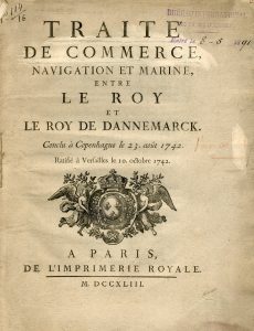 Ile de Sainte-Croix.- Traité de commerce, navigation et marine, entre le Roy et le Roy de Dannemarck. Conclu à Copenhague le 23. Août 1742. Ratifié à Versailles le 10. octobre 1742. Paris, Imprimerie royale, 1744, 4°, [2]-25-1 blanche p., br....
