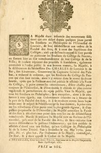 Présente aura été publiée et affichée à la Porte du Collège, à peine contre les contrevenans, d'être chassés pour toujours de l'Université, et d'être traités et châtiés de plus comme vagabonds et perturbateurs du repos public".