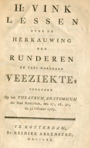 VINK (H[endrik]). Lessen over de herkauwing der runderen en tans woedende veeziekte, gehouden op het Theatrum anatomicum des stad Rotterdam, den 27, 28, 30 en 31 october 1769. Rotterdam, Reinier Arrenberg, 1770, 8°, XVI-124-[4] p., 2 planches...