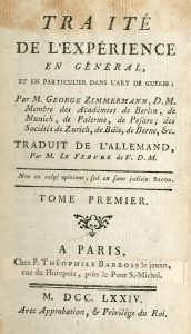 ZIMMERMAN (George). Traité de l'expérience en général, et en particulier dans l'art de guérir. Traduit de l'allemand par Le Febvre. Paris, Vincent (étiquette de relais collée sur l'adresse : Théophile Barrois le jeune), 1774, 2 vol. in-12,...