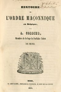 Franc-Maçonnerie.- CORDIER (A.). Histoire de l'ordre maçonnique en Belgique. Mons, H. Chevalier, 1854, 8°, VIII-618 p., demi-chagrin brun à coins, dos à nerfs, titre doré (mors frottés, ex dono moderne à l'encre au faux titre). Envoi de...