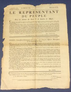 Armée de Sambre-et-Meuse. Placard imprimé à Liège sur l'ordre de Frecine, Représentant du Peuple près les Armées du Nord et de Sambre-et-Meuse. Liège, chez la citoyenne Bollen, le 1er Sans Culotide, an 2me de la République. Dim : 55 x 42 cm...