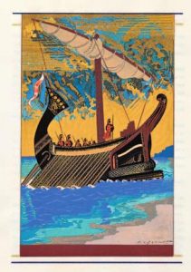 Traduction de Victor Bérard, décorée et ornée de 100 compositions hors-texte par F.-L. Schmied, gravées sur bois par Théo Schmied et mises en couleurs par Saudé. SOMPTUEUSE ÉDITION TIRÉE À 145 EXEMPLAIRES SUR PEAU DE VÉLIN D’UNE RARE QUALITÉ, fournie, d’après la légende, par 3000 chèvres du Haut-Atlas : sur cette peau, les gravures sur bois, les coloris (vifs et d’or), l’impression dûe à Darantière sont d’une extraordinaire « venue ».