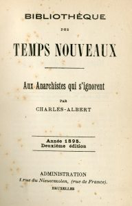 Anarchie.- CHARLES-ALBERT. Aux anarchistes qui s'ignorent. Brux., Bibl. des Temps Nouveaux, 1895, in-12, 36 p.- Suivi de : RECLUS (Elisée). L'Evolution légale et l'anarchie. Même édit., 1895, in-12, 18 p.- Suivi de : ETIEVANT (G.). Un anarchiste...