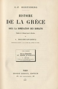HERTZBERG (G.-F.). Histoire de la Grèce sous la domination des Romains. De la conquête au règne d'Auguste. D'Auguste à Septime Sévère. L'Université d'Athènes. P., E. Leroux, 1886-1890, 3 vol. 8°, demi-chagrin brun à coins, auteur, titre et...