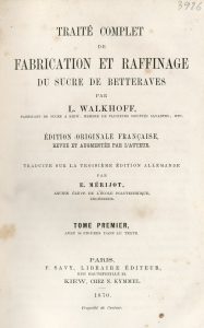 WALKHOFF (L.). Traité complet de fabrication et raffinage du sucre de betteraves. Edition originale française revue et augmentée par l'auteur, traduite sur la troisième édition allemande par E. Mérijot. P., F. Savy, 1870-1871, 2 vol. 8°,...