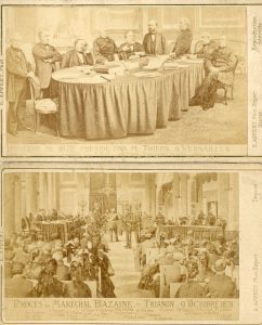 APPERT (F.). Ens. de 2 photos contrecollées sur carton avec nom du photographe imprimé : "Ministère de 1872 présidé par M. Thiers à Versailles" et "Procès du Maréchal Bazaine - Trianon, 6 octobre 1873". Dim. : 6 x 10 cm (lég. effacé).