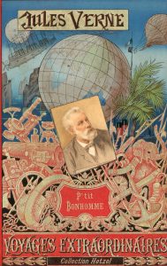 VERNE (Jules). P'tit bonhomme. 85 illustrations par L. Benett. 12 gravures en chromotypographie. 1 carte en couleurs. P., Hetzel, [1893], gd 8°, cart. polychrome édit. au portrait collé, dos au phare, plat infér. au décor noir, tranches dorées,...