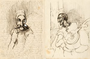 GRANDVILLE (Jean-Jacques). Ensemble de 2 dessins à l'encre de Chine pour le Don Quichotte de Cervantès. Dim.: 11 x 8,5 cm, petit trou dû à l'acidité de l'encre, texte à l'encre au verso d'un des dessins.