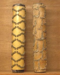 Papier peint.- Ensemble de 2 anciens rouleaux d'impression pour papier peint, en bois et acier. Dim. : (2 x) +/- 59 x 12 x 12 cm.