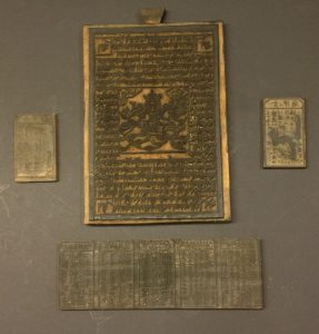 Imprimerie.- Ensemble de 4 planches de caractères d'imprimerie gravés sur bois (3 en chinois recto-verso et 1 thibétain (?) avec illustration centrale.
