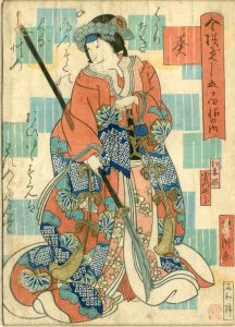 Ecole d'Osaka.- 2 gravures japonaises originales sous passe-partout en lin et cadre en bois naturel, représentant deux acteurs dans des rôles féminins tiré du roman de Gengi. Format koban (16,5 x 24 cm). On distingue des dorures, des argentés...