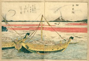 HOKUSAI (1760-1849). Azuma Asobi (divertissements de l'Est [Edo]), volume II (1802). La deuxième page de gauche, dans la disposition ici présentée, montre le comptoir du célèbre éditeur (Tsutaya Juzaburo). Le présent exemplaire constitue en...