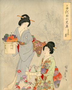 TOYOHARA CHIKANOBU (1838-1912). Ensemble de 14 triptyques et un diptyque de la série "Dames de compagnie du palais Chyioda" - Chyioda no Oh'oku. Editeur : Fukuda Hatsujiro, 1894-1895. Reliés en album, dim. : 23,5 x 35,5 cm. Le titre de la série...
