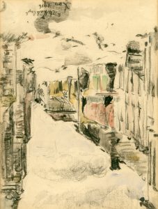 DE KAT (Anne-Pierre). "Loo" (1916). Fusain et aquarelle sur papier, titré, daté, signé et monté sous passe-partout de toile grise et cadre en bois. Dim. cadre : 43 x 33 cm ; sujet : 22 x 17 cm. Dessin exposé à la Rétrospective Anne-Pierre De...