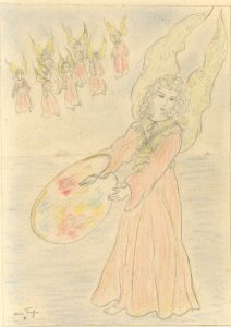 FREY (Alice). Sans titre. Mine de plomb et crayons de couleurs, signée au coin infér. gauche et montée sous passe-partout blanc et cadre en bois. Dim. cadre : 38 x 31 cm ; sujet : 19 x 14 cm.