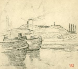 MEUNIER (Constantin). "Canal de Charleroi". Fusain sur papier, monogrammé du cachet rouge, monté sous passe-partout crème et cadre doré en bois. Dim. cadre : 31 x 33 cm ; sujet : 25 x 27 cm.