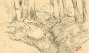 MEUNIER (Constantin). Sans titre [Sous-bois]. Fusain sur papier, monogrammé du cachet rouge, monté sous passe-partout crème et cadre doré en bois. Dim. cadre : 25 x 33 cm ; sujet : 14 x 22 cm.