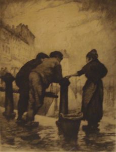 PEISER (Kurt). "Au coin du quai". Eau-forte en noir, titrée, signée au crayon et montée sous passe-partout de toile grège et cadre en bois. Dim. cadre : 60 x 47,5 cm ; sujet : 39,5 x 29,5 cm.