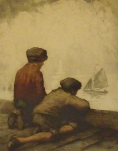 PEISER (Kurt). "Gamins de pêcheurs". Eau-forte en couleurs, titrée, signée au crayon et montée sous passe-partout et cadre en bois. Dim. cadre : 59 x 56 cm ; sujet : 39,5 x 30,5 cm.