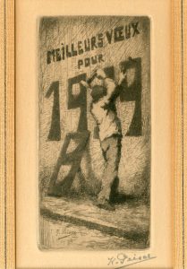 PEISER (Kurt). "Meilleurs voeux pour 1939". Eau-forte en noir tirée sur vélin crème, signée au crayon et montée sous passe-partout et verre. Dim. cadre : 24 x 18 cm ; sujet : 12,5 x 6 cm.