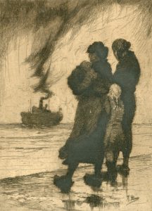 PEISER (Kurt). Sans titre [Scènes au port d'Anvers]. Ensemble de 2 petites eaux-fortes en noir, signées au crayon et montées individuellement sous passe-partout et cadre en bois. Dim. cadre : 21 x 16 cm et 22,5 x 16,5 cm ; sujet : 11,5 x 8 cm et...