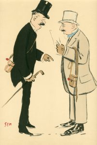 SEM (Georges GOURSAT, dit). "Robert Hennessy et le comte de Turenne". Lithographie en couleurs, titrée, signée dans la planche et montée sous cadre en bois. Dim. cadre : 54,5 cm x 38 ; support et sujet : 51,5 x 35 cm.
