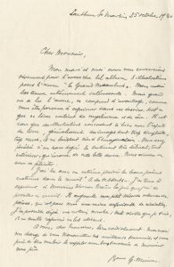 couleurs (coloriées à la main, avec des différences d'un ex. à l'autre), br., couv. à rabats (couv. défr. avec petits manques, queue du dos rongé, rousseurs claires). Édit. tirée à 331 ex. num. 1/300 Featherweight. On joint un précieux dossier d'autographes concernant l'illustration du Grand Meaulnes par Paul Eeckhout : RIVIÈRE (Isabelle) (1889-1971), soeur d'Alain-Fournier (1886-1914), épouse de Jacques Rivière (1886-1925). Elle consacra sa vie à la mémoire de son frère. Correspondance à Paul Eeckhout : 1 carte postale et 3 lettres. - Lettre autographe signée, Dourgne le 2 févr. 1939, 2 p. 8°, enveloppe conservée. Ni Isabelle Rivière ni l'éditeur ne peuvent donner l'autorisation de reproduire le texte du grand Meaulnes. « Mais l'éditeur et moi nous sommes mis d'accord pour vous donner l'autorisation de publier votre album de dessins sous le titre Illustrations pour le Grand Meaulnes, mais sans aucune ligne de texte autre que les titres des chapitres à quoi se rapporte chacune de vos illustrations. » - Lettre autographe signée, Dourgne le 22 févr. 1939, 1 p. 8°, enveloppe conservée. « Je suis désolée de vous peiner, mais il m'est tout à fait impossible de faire pour vos illustrations la préface que vous auriez souhaité[e]. Je suis même obligée de vous demander de ne faire en aucun cas état de l'autorisation que je vous ai donnée de les publiées, de n'en parler ni dans l'introduction de votre frère, ni dans votre bulletin de souscription - nulle part en un mot - car vous me feriez avoir des ennuis avec l'éditeur, cette autorisation qu'il a accordée à regret, sur ma demande, étant, je vous l'ai dit, contraire paraît-il aux règles de l'édition. » - Lettre autographe signée, Dourgne le 22 févr. 1940, 1 p. 8°, enveloppe conservée. Isabelle Rivière accuse réception « de ce bel album, si remarquablement présenté ». Mais : « Malgré l'habile défense de votre frère, je persiste à trouver que l'abus du noir durcit vos images et les rend par trop elliptiques, et vos fraîches petites lettrines me font encore plus regretter que vous n'ayez pas employé une technique moins volontaire, plus naïve - disons plus enfantine, et donc plus proche du Grand Meaulnes, où vos jeunes dons eussent mieux trouvé, il me semble, à s'exercer. » - Carte postale (Rembrandt, Saint Mathieu), autographe signée, Dourgne le 1er juin 1940. Isabelle Rivière n'a encore rien reçu de Paul Eeckhout. « Ma maison est pleine jusqu'au grenier d'amis belges et on en retrouve d'autres chaque jours »... MINNE (Baronne George), femme du sculpteur George Minne (1866-1941). Lettre autographe signée à Paul Eeckhout, Laethem-St-Martin le 25 oct. 1940, 1 p. 4°, enveloppe conservée. Lettre de remerciement à la réception d'un exemplaire du livre. « Mon mari les trouve [les illustrations] extrêmement intéressantes. Mais quand on a lu l'oeuvre, on comprend d'avantage, comme vous êtes parvenu à exprimer dans ces dessins, tout ce que ce livre contient de mystérieux et de rêve », etc. Le sculpteur allait disparaître le 15 février 1941. WEYERGANS (Franz) (1912-1974), écrivain belge. Lettre autographe signée, Bruxelles le 16 juin 1941, 2 p. 4° (pliures, traces de perforation). Belle lettre. Il ne parlera pas de son livre, Stéphane Rey [Thomas Owen] s'en chargera sans doute. « Je puis vous dire cependant que je l'aime. Vous avez réussi surtout le côté paysan du livre. Les images d'intérieur sont très belles. Vous avez admirablement utilisé le jeu du blanc [?] le noir pour créer le mystère - un mystère qui baigne les choses sans les cacher, ce secret d'Alain Fournier. » Etc. GEVERS (Marie) (1883-1975), écrivaine belge. Lettre autographe signée à Paul Eeckhout, Missembourg le 24 avril 1942, 1 p. 4°, enveloppe conservée. Belle lettre d'admiration et de remerciement à la réception d'un exemplaire du livre : « Je me réjouis de posséder le précieux exemplaire dont vous voulez bien me faire don. » Plus loin : « Je feuilleterai souvent ce beau livre, et je vous félicite, d'abord de l'avoir "pensé" puis de l'avoir exécuté. » - RIVIÈRE (Alain) (1920-2010), fils d'Isabelle Fournier et de Jacques Rivière. Deux lettres autographes signées à Paul Eeckhout, datées du 14 mai et 10 juin 1986, 2 p. 8° et 1 p. 4°, une enveloppe conservée. Alain Rivière est prêt à recevoir la visite de Paul Eeckhout dont il se souvient bien du nom et dont il a toujours les illustrations faites pour le Grand Meaulnes. - OGNY (Comte Jean d'), dirigeant monarchiste FN, propriétaire du château de la Chapelle d'Angillon. Lettre autographe signée à Paul Eeckhout, Château de la Chapelle d'Angillon le 7 juin 1986, 1 p. 8°, enveloppe conservée, timbre découpé. Le comte attend Paul Eeckhout et ses amis pour une visite du château dont une partie est consacrée à Alain-Fournier. Carte postale du château jointe. Ens. 12 pièces.