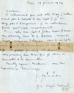 sujet), je ne songe pas à l'acquérir : je ne collectionne guère que l'école impressionniste. / Pour votre eau-forte de John Lewis-Brown, vous pourriez voir M. Le Garrec, maison Sagot [...]". Félix Fénéon est un critique d'art, journaliste et directeur de revues (e.a. "La Revue blanche") français, né à Turin en 1861 et mort à Châtenay-Malabry (Hauts-de-Seine) en 1944. Anarchiste, il est inculpé, en 1894, lors du Procès des Trente.